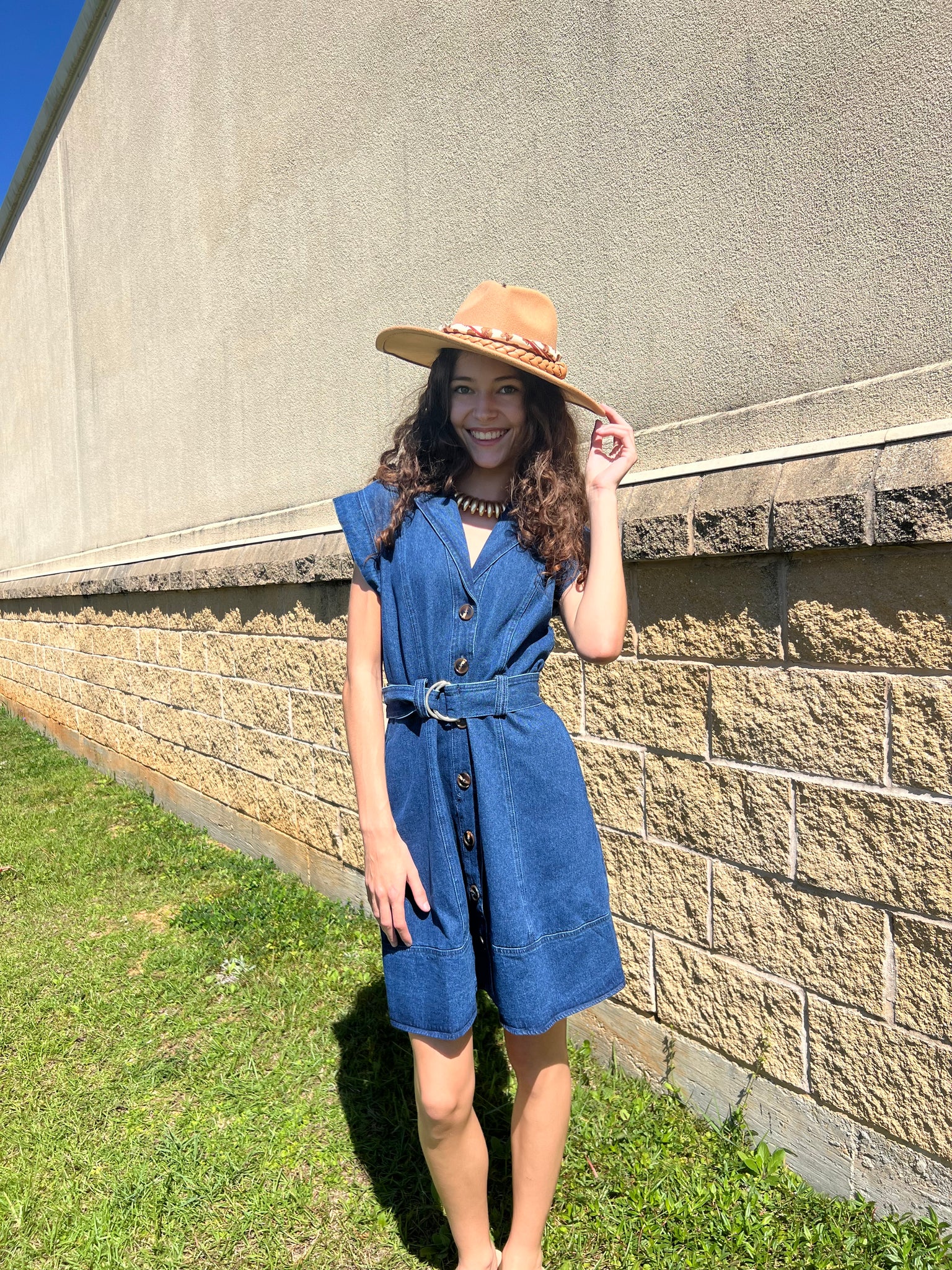 Best way to feel casual and look stunning! Tortoise shell buttons up the front give extra dimension to this collared cap sleeve dress that is truly a year round style. Self belt.