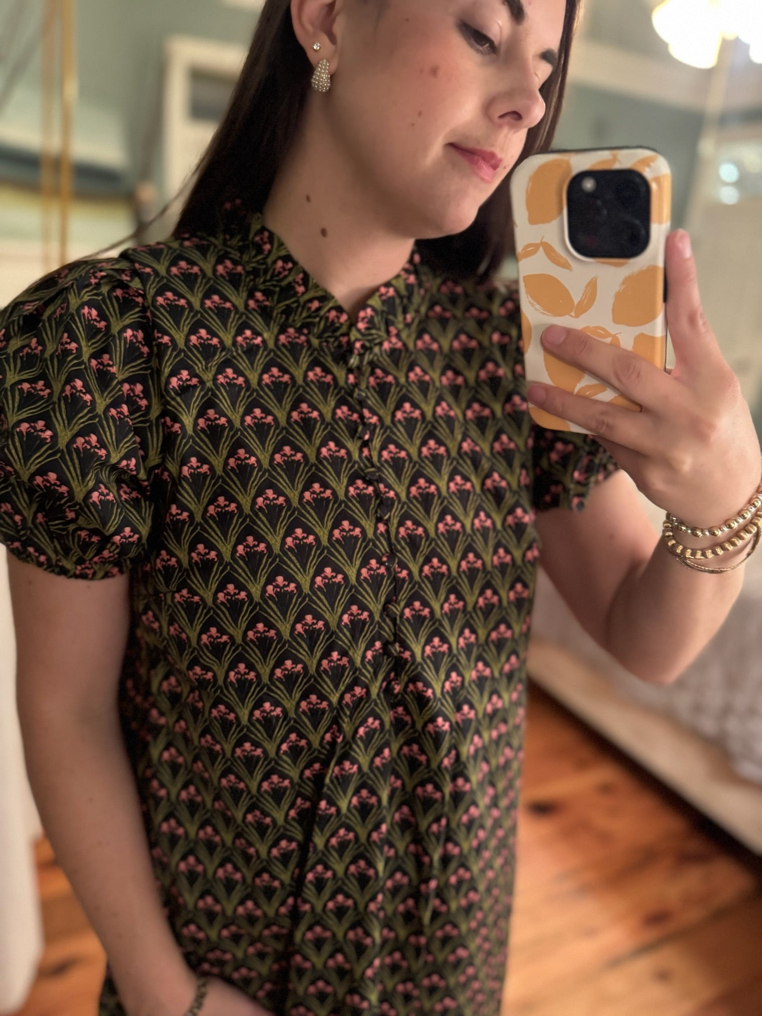 Floral print shoulder pleated dress has puff sleeve, a wide ruffle hem on this midi dress.