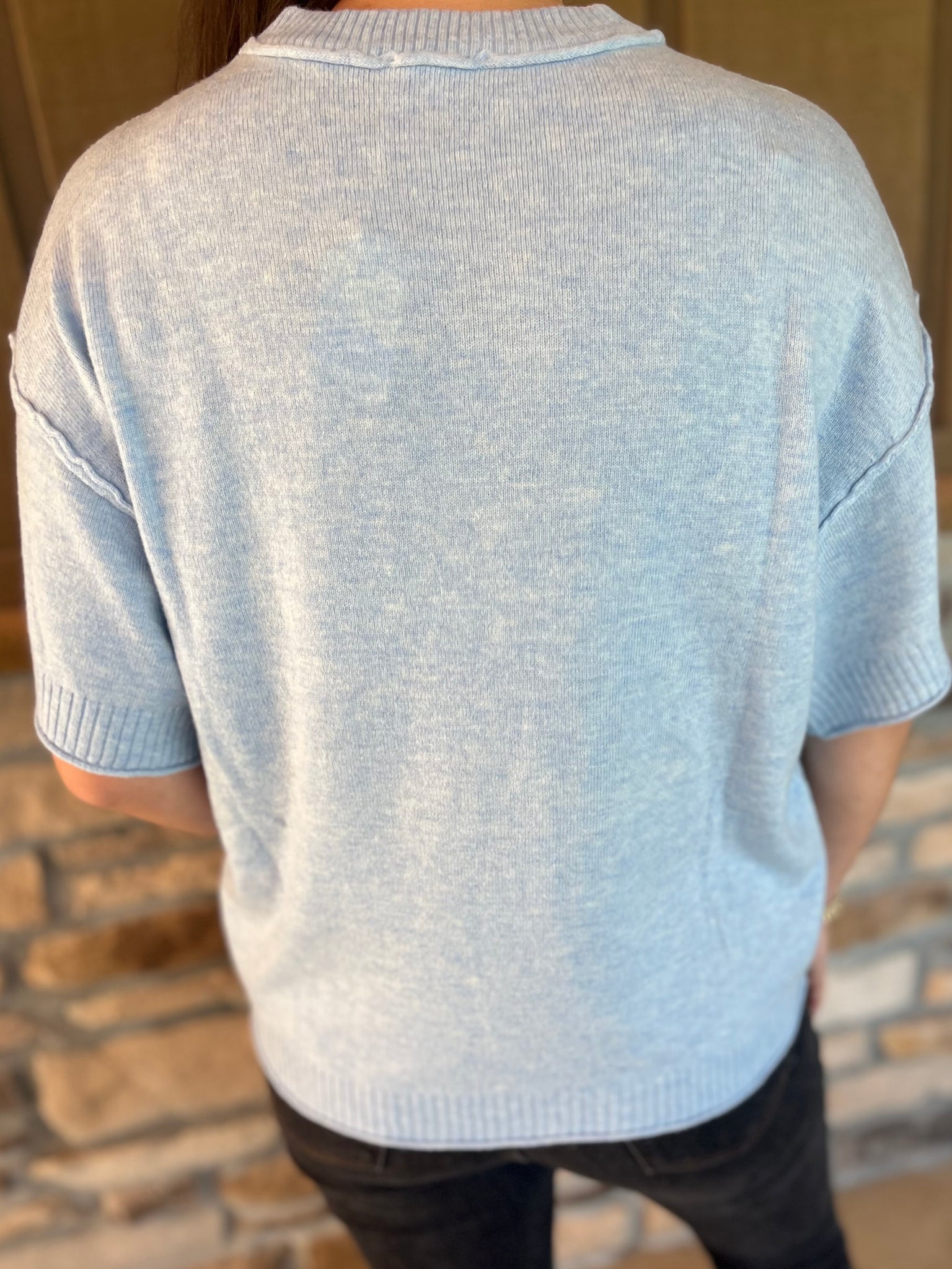 A Powder Blue drop shoulder comfy sweater top with raw edge detail is a soothing yet fall comfy addition to your closet.