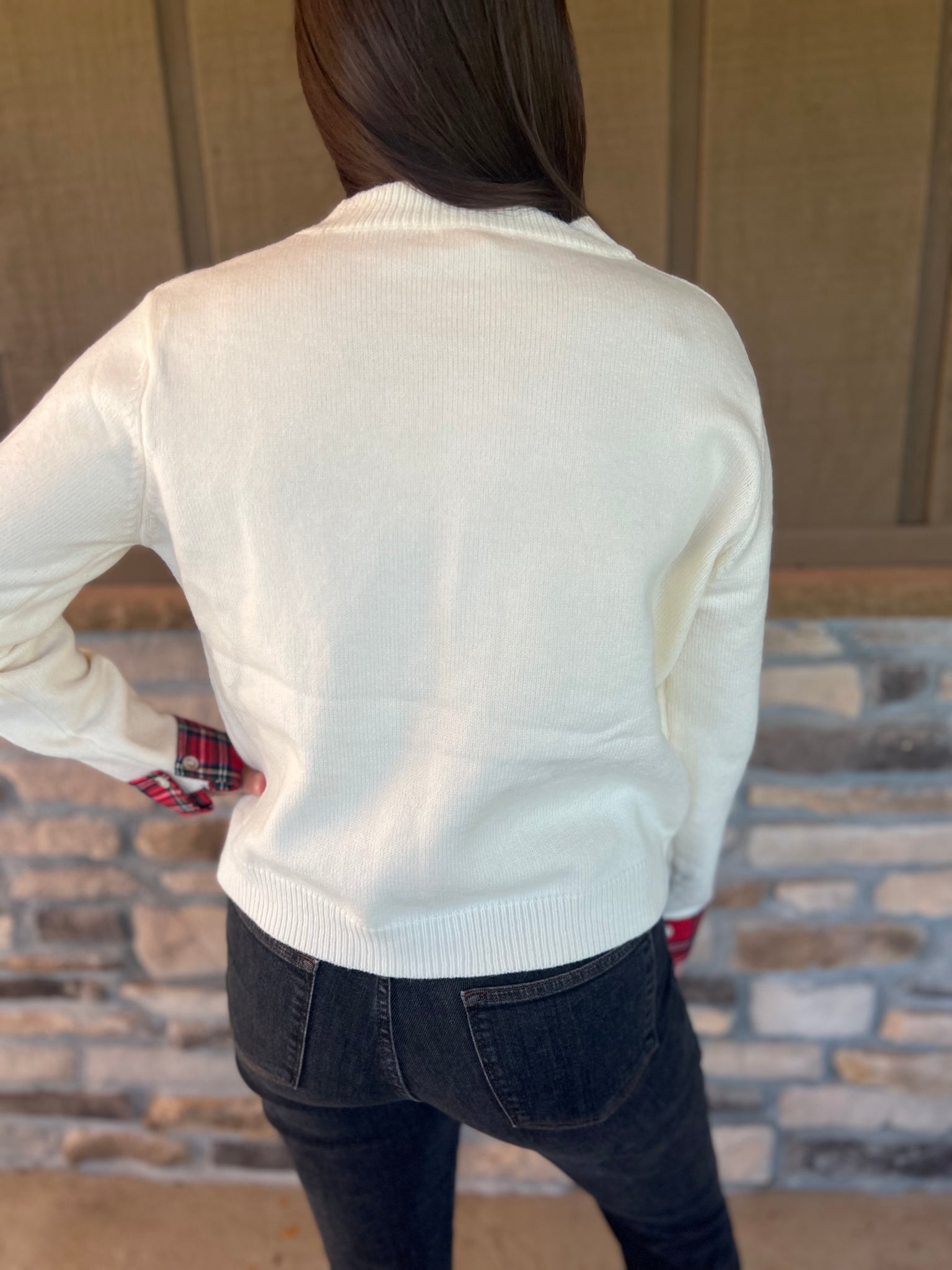 The Plaid trim, long sleeve knit cardigan features all the trends with covered buttons and contrast plaid piping along the placket and cuffs.