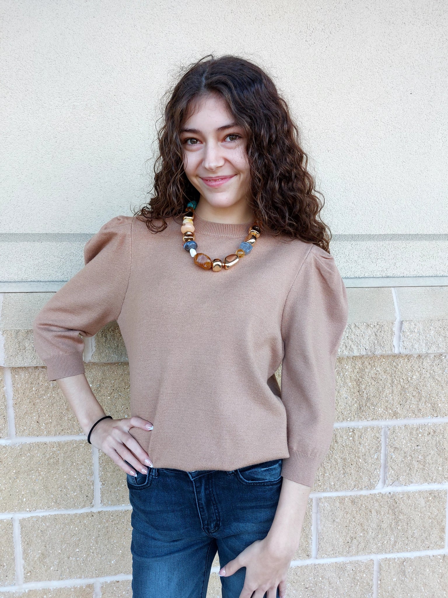 Soft 3/4 sleeve sweater is comfortable alone or under a smart jacket.