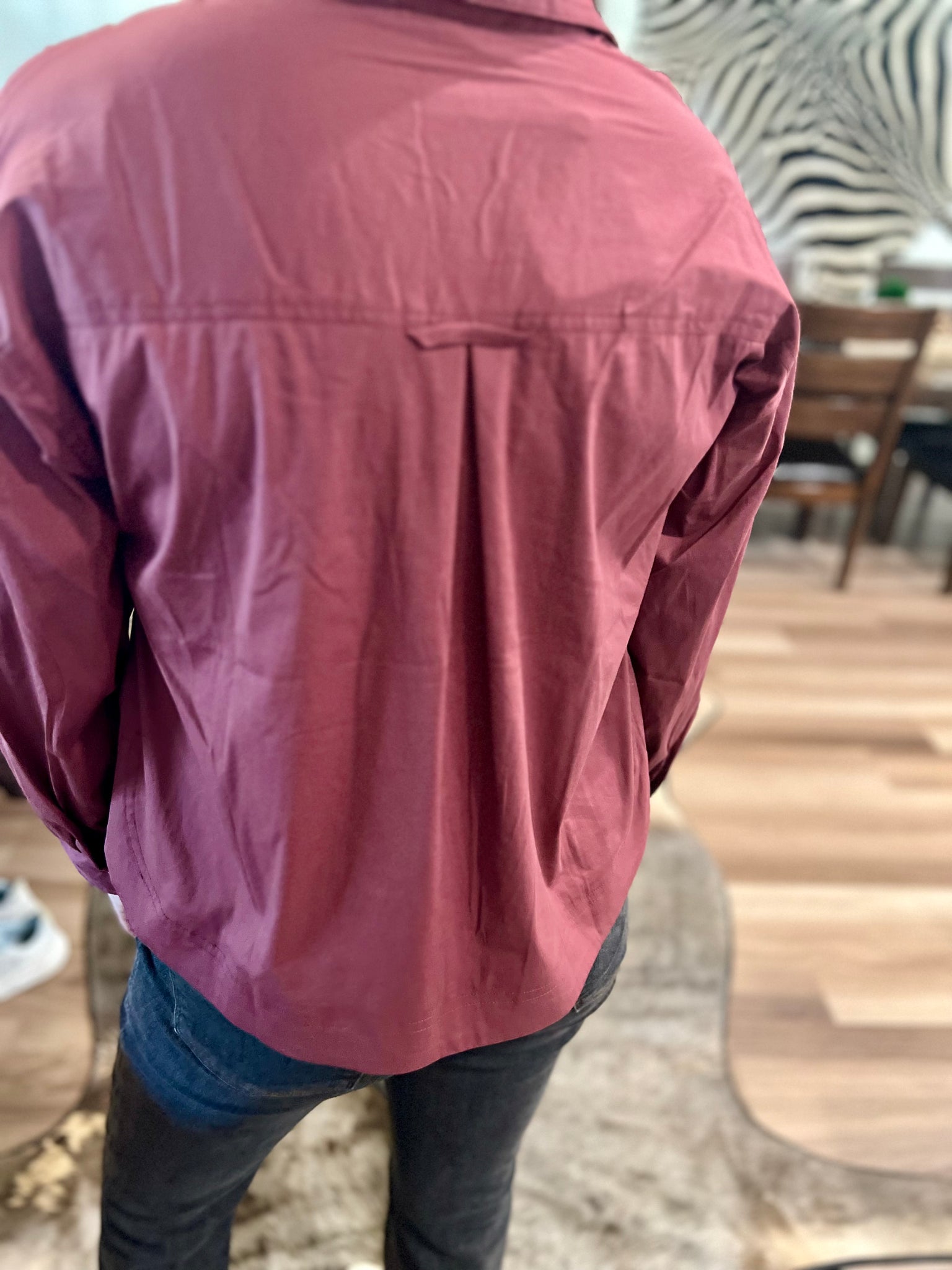 Solid long shirt sleeve spread collar pullover top. Single shirt pocket. Unlined. Woven. Semi-sheer.