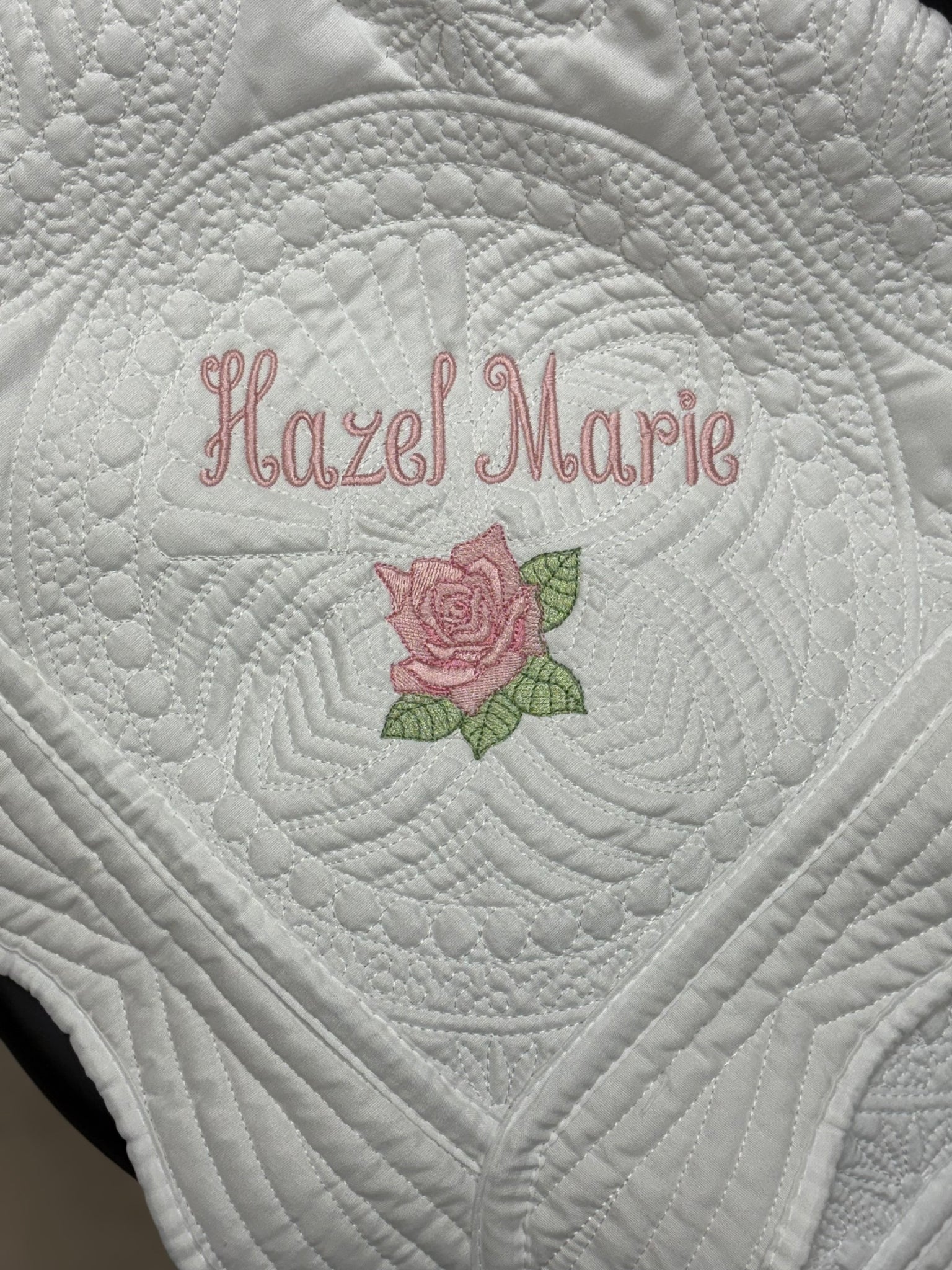 Crib size baby quilt will be a much loved blanket for baby and a family heirloom to be passed down for generations.